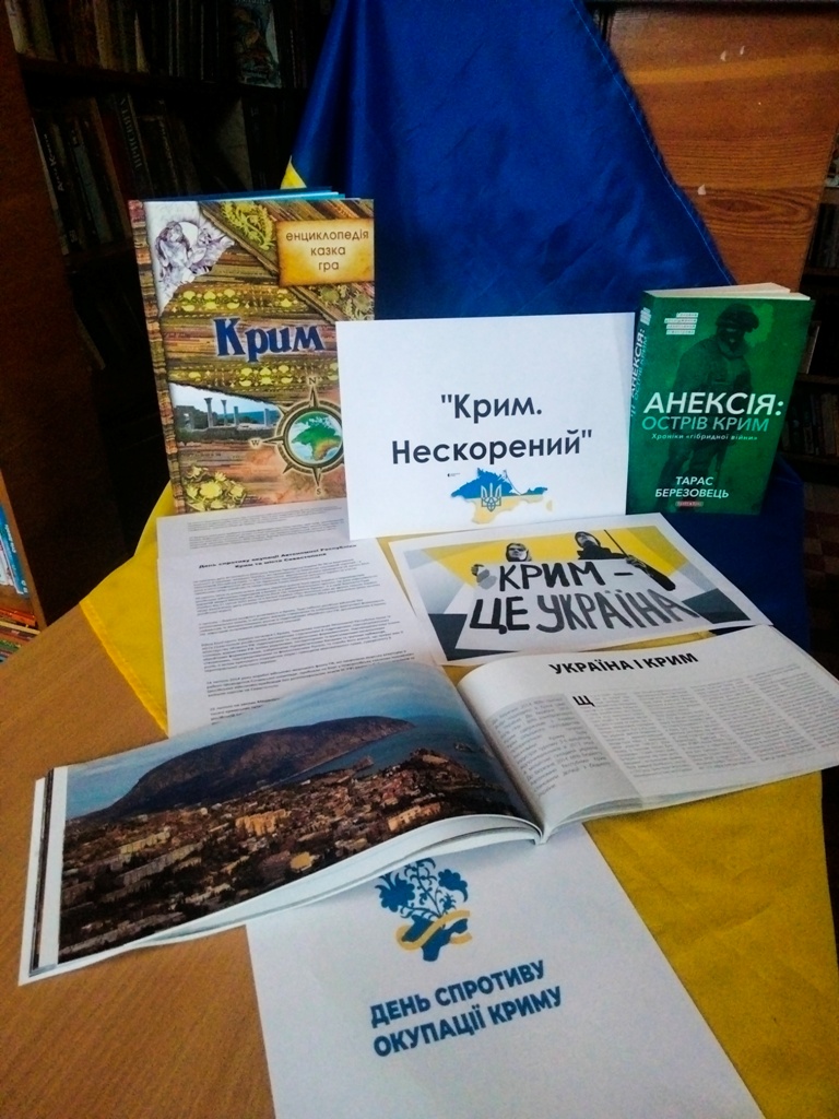 Для читачів в міській бібліотеці-філії №4 оформлена міні викладка літератури “Крим. Нескорений”, на якій представлені видання про історію, традиції та звичаї корінного населення Криму, видання про події 2014 року.