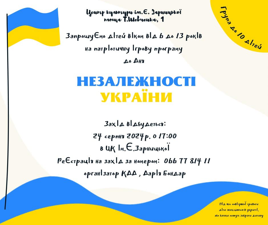 Вік: від 6 до 13 років Коли: 24.08.2024 Час: 17:00 Де: ЦК ім.Є.Зарницької Як: БЕЗКОШТОВНО Обов’язкова реєстрація : 066 7781411