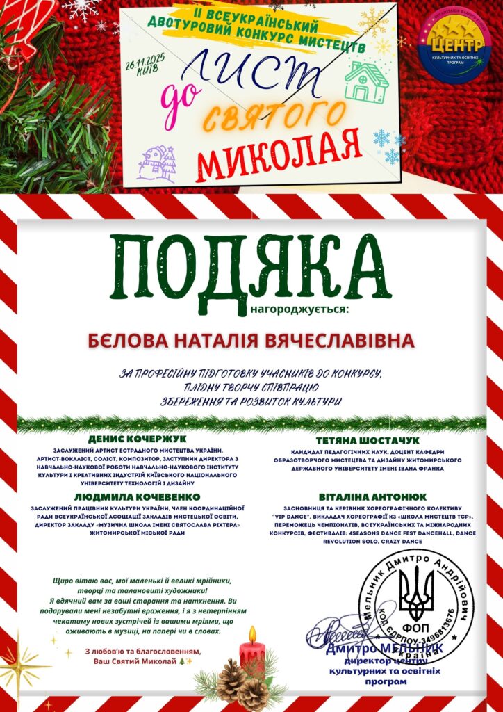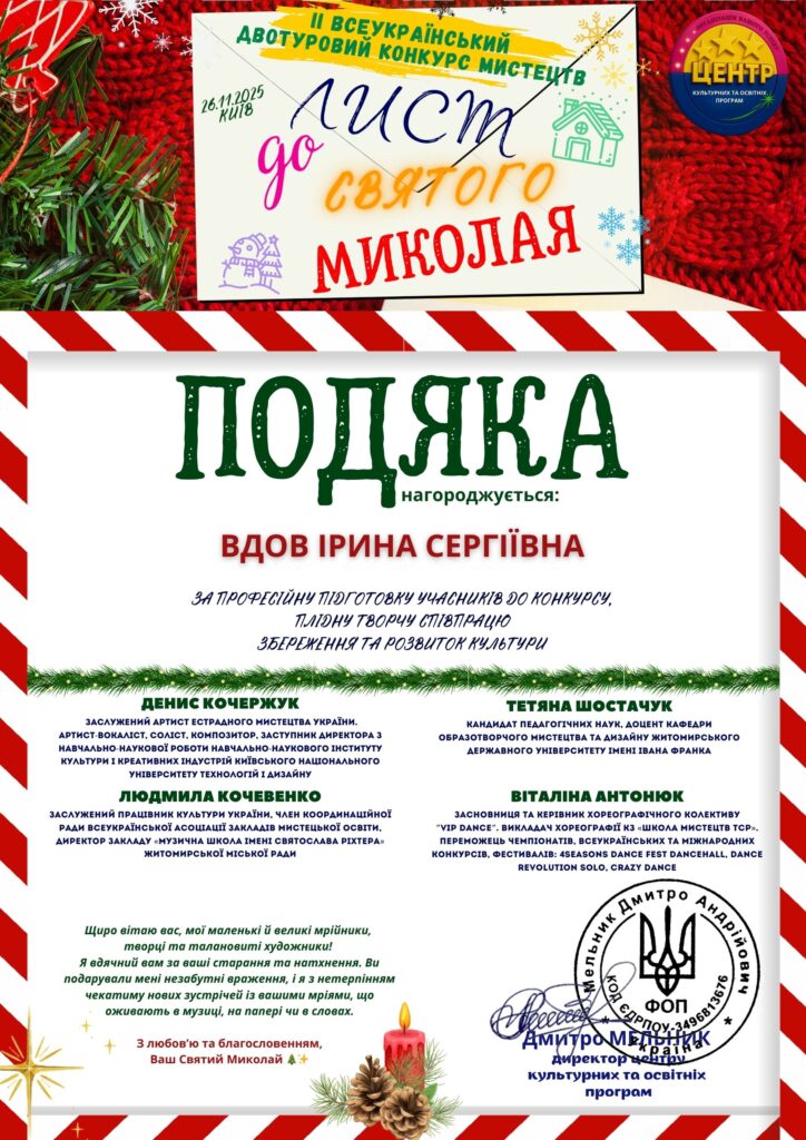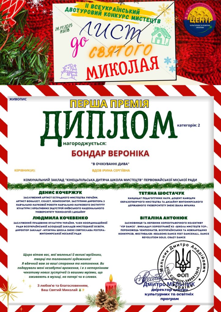 В Новий рік з Перемогою! Вихованці комунального закладу «Кінецьпільська дитяча школа мистецтв» напередодні Нового року взяли участь в ІІ Всеукраїнському двотуровому конкурсі мистецтв «Лист до святого Миколая» та отримали гарні реультати: